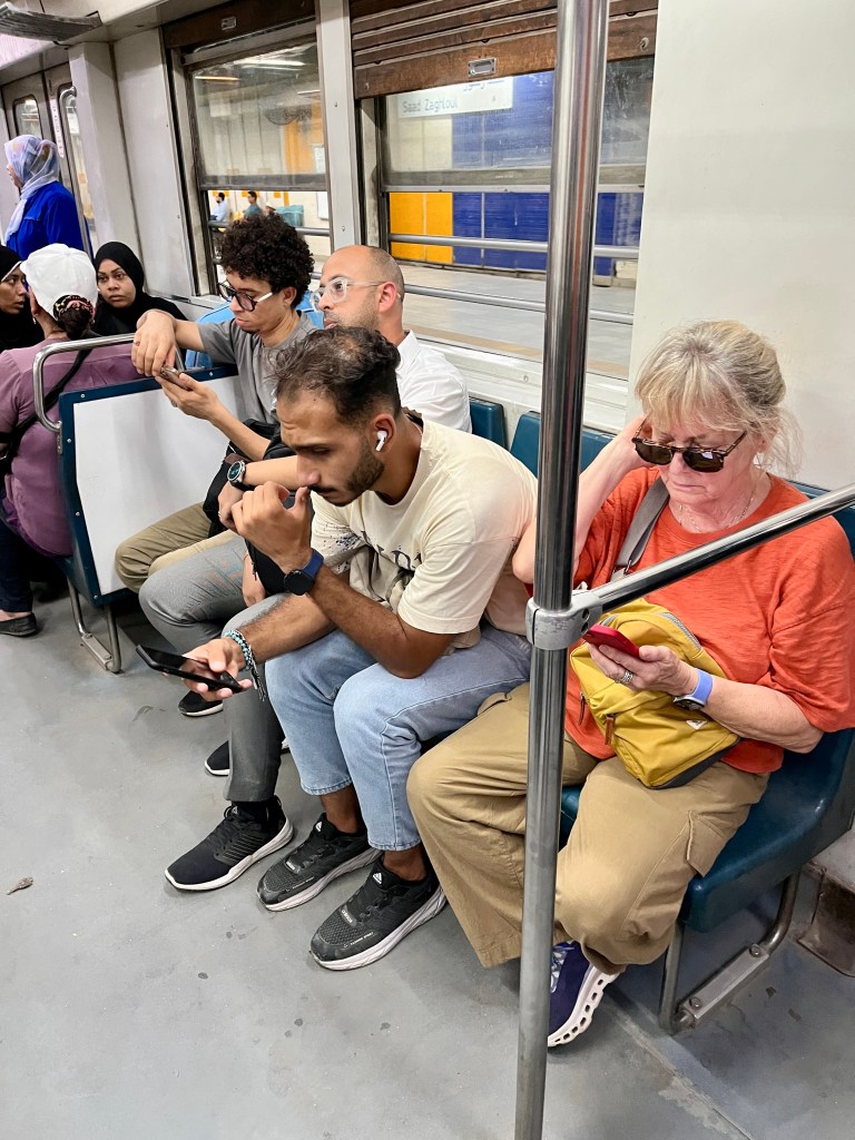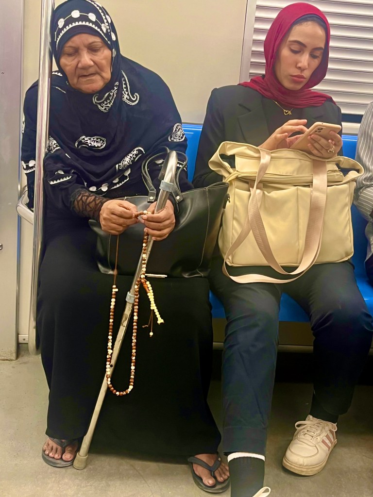Most every day, Marcie and I make a 30-minute trip to and from St. Andrew’s on the train. Some cars are air-conditioned; most are not. There is a “women only” car. On our car, Marcie took this great photo of two women; one a professional woman and the other a woman praying with her prayer beads.